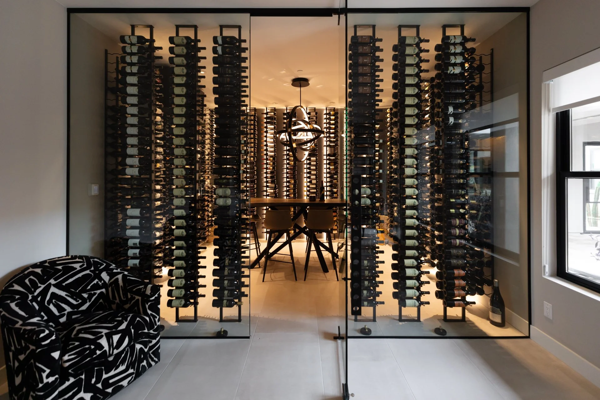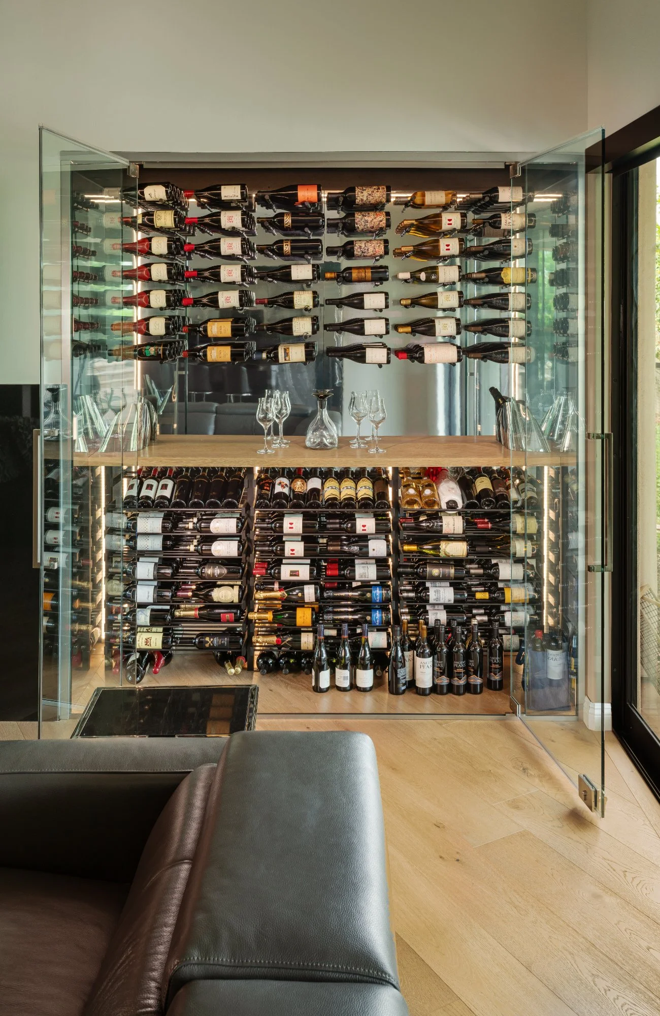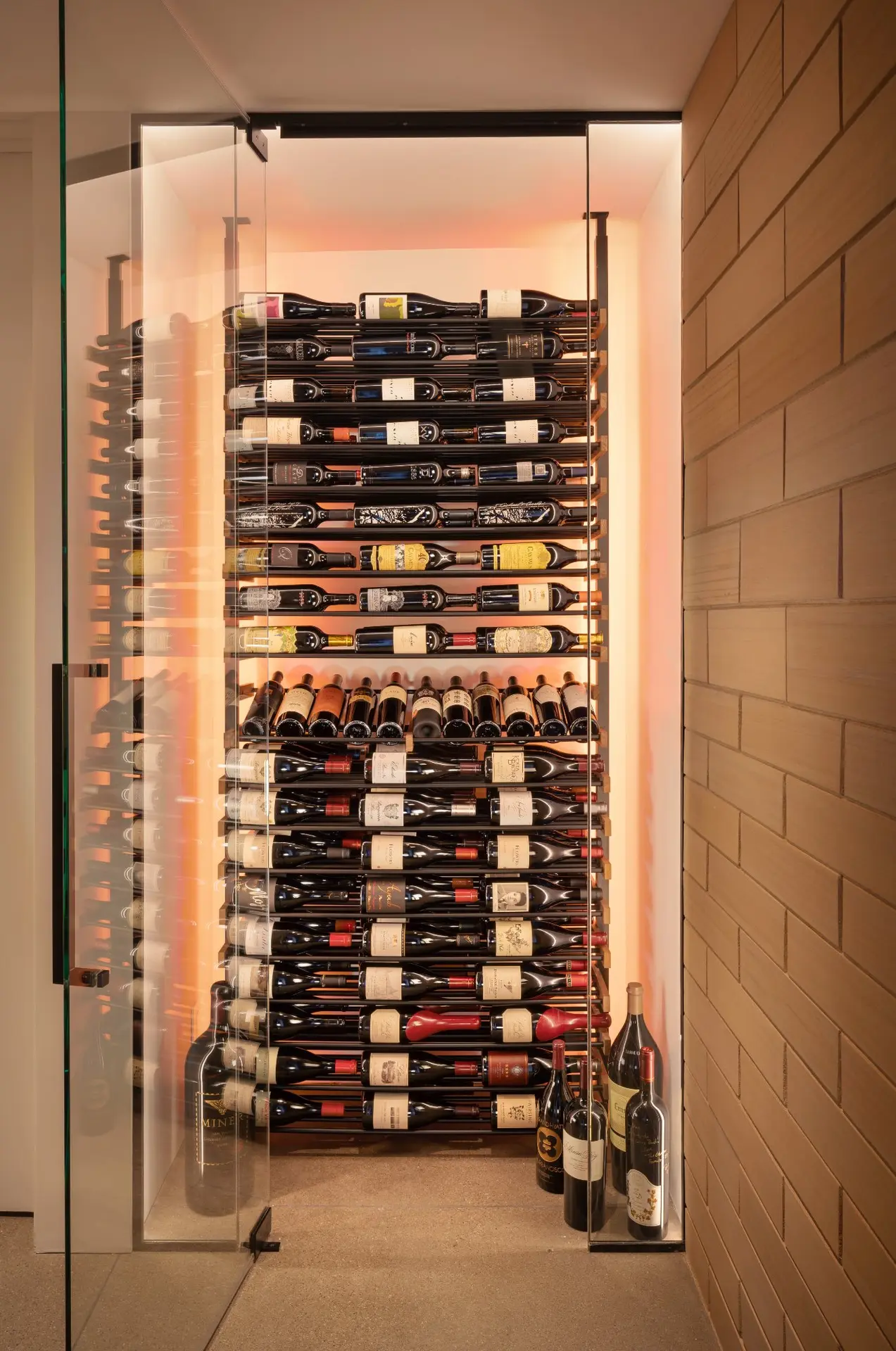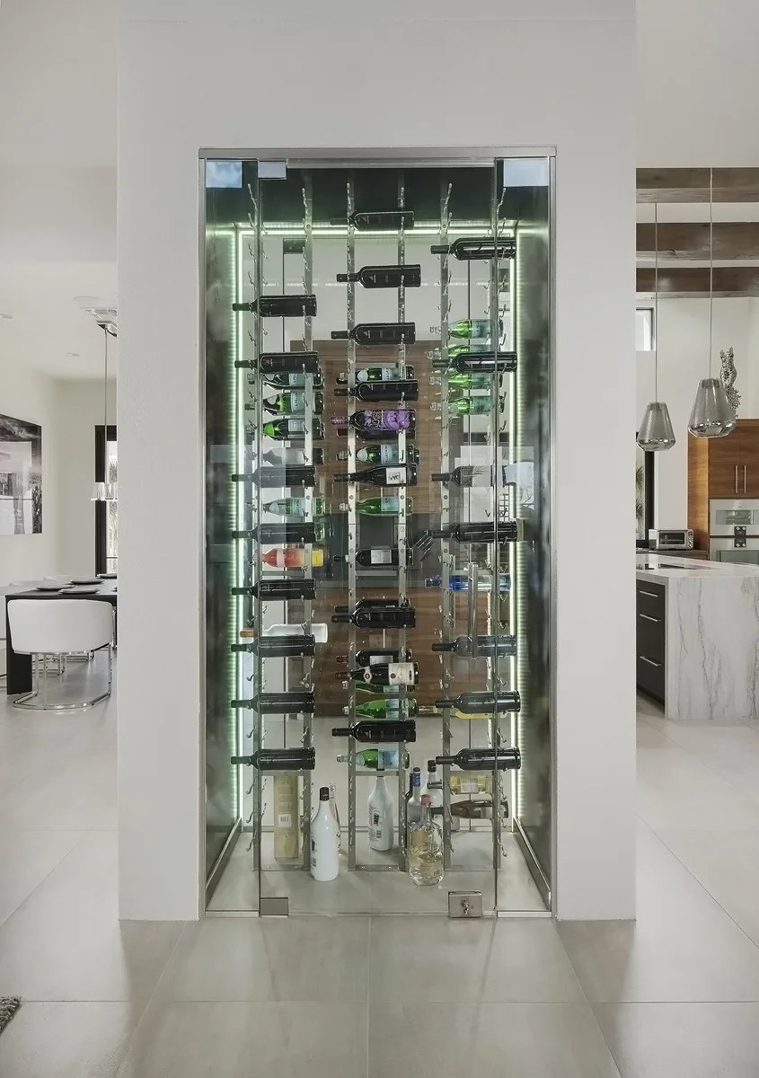 Minimalist design, clean geometry, and architectural glass define this modern wine cellar style. Each space is engineered for precise climate control while showcasing the collection as a visual centerpiece. Our contemporary cellars pair metal accents, frameless enclosures, and integrated LED lighting for a sleek, gallery-like display.